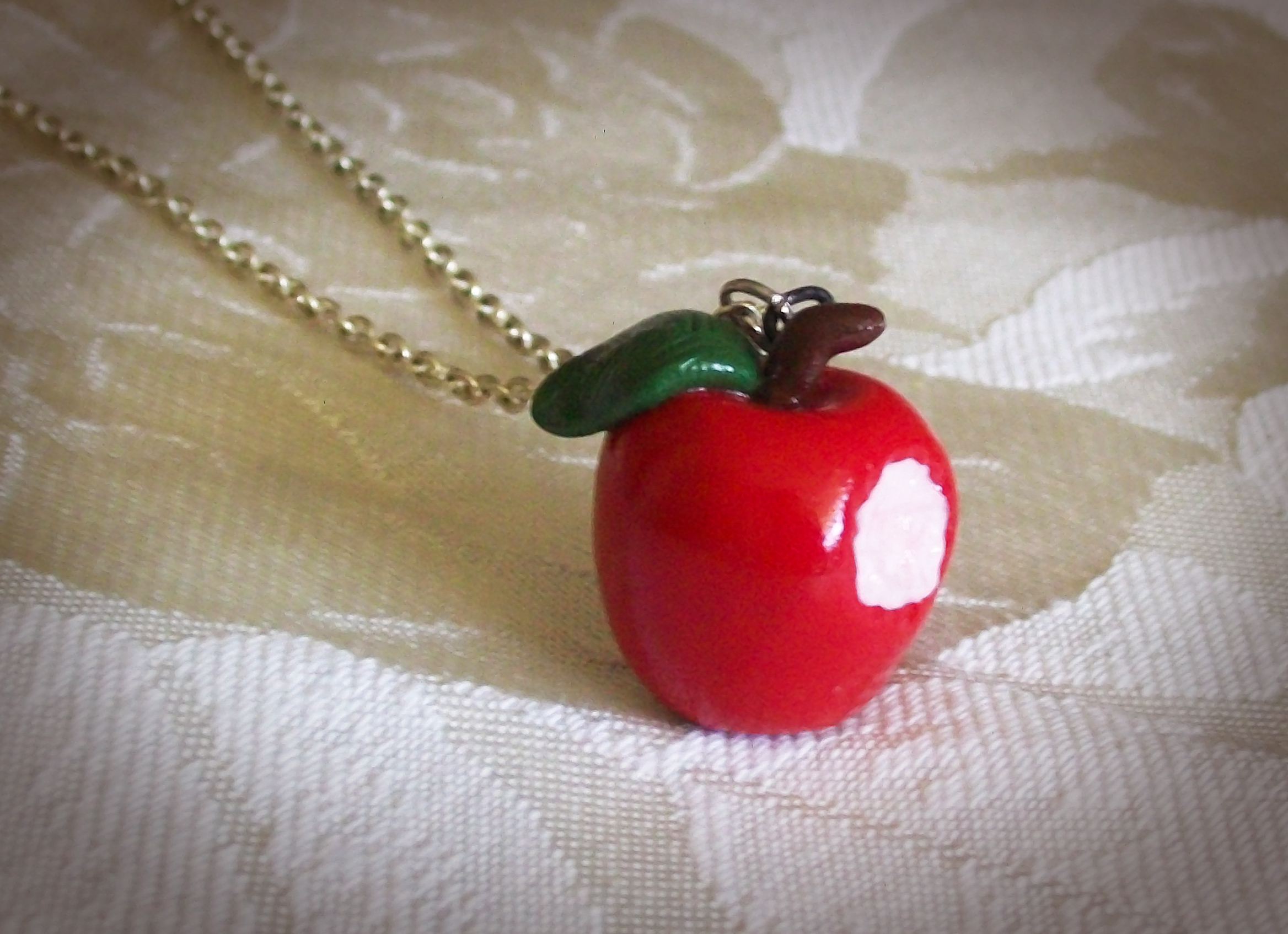 This apple is about 1" tall, created from durable polymer clay, and sealed with a protective coat of polyurethane. It comes on an 18" cable chain. I can make the necklace shorter or longer, or use a black leather cord if you prefer. Please leave a note at checkout with custom preferences.