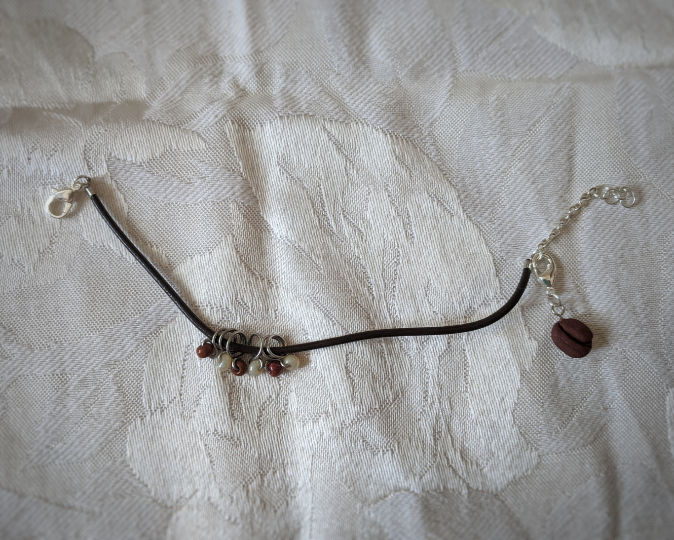This sweet, simple bracelet has 6 snag-less lace knitting stitch markers that will fit up to a size 8 needle. The coffee bean charm clips on the end of the bracelet to keep the markers on when you take off the bracelet, and can double as a progress marker. The white and tan stitch markers reflect the beautiful colors of coffee, lattes, flat whites, and more
